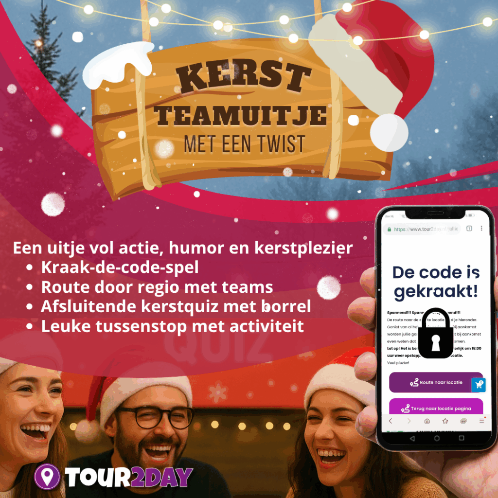 In teams trekken jullie door West-Friesland, zonder te weten waar jullie naartoe gaan. Onderweg wachten kerstpuzzels, leuke opdrachten en… een beetje sabotage